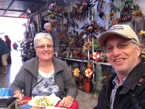 We paid $6 to park in a parking lot on the US side then walked into Mexico. The town is known for inexpensive dental work, medicines, liquor, vanilla, and eye glasses. There are also an incredible amount of locals selling their various wares including metal sculptures, leather goods, painted pottery and wood items, jewelry, and blankets. Walking by the shops was like walking a gauntlet with sellers trying to interest you in their items or hawkers trying to direct you to a particular business. Everyone had their spiel. Many sellers pointed out how nice Laurie’s camera was. Then when we passed them again they all remembered him by his camera and said something along the line of, “It’s you again!” We bought some inexpensive vanilla (34 ounces for $3.50) which we’ll give a try. We also bought tacos from a cart called “Lupita’s Shrimp & Fish Tacos”. We had one of each type and they were delicious and the ingredients were very fresh. There was a little enclosed courtyard nearby where we stopped to eat them. (Only $4 for the 2 tacos.) Right after we bought ours a long line formed of people waiting to order so it must be a well-known place. It was a very unique town to visit! We ended a wonderful day with some episodes of Fringe and ice cream.