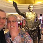 We went to Caesar’s before meeting with M&D/G&G to explore the Caesar Palace property (which is huge). The rewards promotion that M&D/G&G are participating in requires them to earn 25 points at as many Caesar Entertainment casinos as possible so today we hit more casinos. We are getting our exercise through lots of walking, on the strip as well as inside the huge hotels. We had cocktail hour in Harrah’s Diamond Club today, then M&D/G&G took us to dinner at Ruth’s Chris Steakhouse for a fabulous steak dinner that we still dream about. We all had filets that melted in our mouths along with a delicious chopped salad, loaded baked potatoes, and au gratin potatoes. We fudged a little and said it was Laurie’s birthday and we got a small, beautifully presented cheesecake that was also yummy.