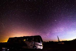 A chilly but beautiful, sunny start to the day. It was our turn to help out with breakfast so we started early organizing then serving the food. Today was French toast, scrambled eggs, and ham. More good conversation until 10:00 when Laurie went off to a Maintenance Roundtable seminar and Pat headed back to the coach. We drove into town in the afternoon to wonder around the booths that were already set up across the street from the big tent which opens Saturday. Bought a step cover, a visor for Pat, and a coupon of small tools for Laurie. Relaxed at the coach a bit then headed over for dinner which started out as a salad bar then pulled pork sandwiches, cole slaw, and baked beans were served. There was also a dessert bar with a wide assortment of items from the people assigned to bring dessert today. We brought Nicole’s Cheese Bars. We’ve spent a lot of time chatting with our table neighbors, Tom and Linda Binder from Reading, PA. After dinner we sat around the campfire for a little while before going in to watch some more Fringe. Before turning in Laurie went out to take some pictures of the stars. It was a bit hazy but directly overhead you could see an amazing amount of stars.
