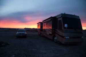 In preparation for not having hook-ups starting later today, this morning we made an appetizer to bring this evening, dessert to bring tomorrow evening, and did a last load of laundry. Took off around 12:00 for Quartzsite which was only about 40 minutes away. Our “Beaver” group is parked about 8 miles outsides of town in the desert area called Road Runner. We’re parked facing south so we can see sunrises and sunsets out the sides of the coach. Today was spent getting settled in, registration, a “heavy” appetizer pot luck dinner, and sitting around a campfire. We can’t stress enough how wonderful all the people we meet are. Some are for the first time and others we’ve met at past rallies. People are from all over the country. Some from the next town over in Everett, WA, all the way to New Hampshire. We returned to our coach about 7:00 to watch a couple of episodes of Fringe before we turned in.