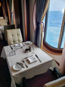 The Captain had announced during Happy Hour yesterday that we were going to have to stop in Bermuda due to a medical emergency onboard. The ship increased it’s speed and we got there around 2:00 am and stayed until about 5:00 am, with lots of sleep-interrupting noises and vibrations throughout that time while the ship docked. Our usual start with coffee in the Crown Lounge followed by breakfast in the Windjammer. Both places were much less busy than usual – probably due to the time change. It’s another mostly cloudy, slightly cooler, breezy day. We ended up reading in the Schooner Bar and stopped by Next Cruise to check out brochures. We saw a couple cruises for fall 2025 that we wanted to get prices on but since they were so busy we went back to our stateroom to look it up ourselves. On the way we checked out our new dining table 6:45/381 which is a table for 2 right at the window – very nice! Due to our disrupted sleep last night it was time for a nap and some relaxing. Happy Hour was in Blaze again since the lounge was packed. We dined in Windjammer and turned in a little early. (Another time change – 4 more to go. +5 hours from home time.)