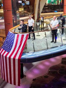 Our usual Crown Lounge and Windjammer start to the day. We spent the rest of the morning in the Schooner Bar, mostly reading. At 11:15 there was a “Salute to Heroes Veterans Tribute” in the Promenade at which we had a front row view of from the Schooner Bar. It started with the Oasis of the Seas Orchestra playing some Big Band music. Then the cruise director led a program which included recognizing the branches of service, playing of the national anthem, a veteran reading a poem for the fallen, the playing of Taps, and further military branch music by the orchestra. It’s another cool, mostly cloudy day so we headed back to our room rather than outside. A good choice as some rain came through at times and sometimes you couldn’t tell where the sky ended and the water began. Our usual Happy Hour these days is picking up appetizers in the packed Crown Lounge and then going across the way to the Blaze lounge. The atmosphere in the Blaze is quieter and darker, almost dungeon-like, and our wonderful waiter Gede comes through there for our drink orders. We finally made it to the dining room and table 381 on deck 3 which is right up against the window for a view of the water rushing by. Our waiters, Rahmat and Dolridge, were very good and we’re happy with them. Since our dining time is 6:45 we finished up and had time to digest a bit before going to sleep.