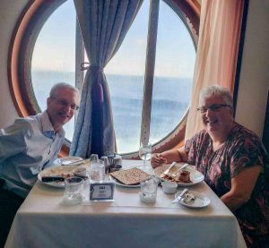 On waking shortly after 5:00 we saw some lightning off in the distance out our window. It looked like the helicopter pad was wet but it wasn’t raining the moment. The Crown Lounge for coffee this morning was a bit of a different experience than last cruise due to a very large number of Diamond tier and up people. There were more people in the lounge earlier, and there seemed to constantly be a line of 7-8 people waiting to use the coffee machine. We’ll see if they address the issue in the next day or two. (We later found out that these were the numbers for the different tiers: Gold 911, Platinum 616, Emerald 341, Diamond 1,082, Diamond Plus 1,024, and Pinnacle 282.) We had an early breakfast in Windjammer then went to the Solarium to read. This Solarium is not fully enclosed  which made it really windy so we soon moved to a spot in the pool area which was less windy and had a nice view of the water. Back in our room about 12:30 we found our room still hadn’t been cleaned so we spent time getting that corrected. Turns out we have a new room steward named Karla who was having a mixed up day but will give our room early cleaning starting tomorrow. After relaxing the afternoon away, we had a drink in Blaze, the comedy club across from the packed Crown Lounge, before going up to Windjammer where a Passover Seder was being held by a Rabbi Aryeh.