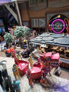 We were in the Crown Lounge for a little while then decided to go up to deck 15 at the front to see what was happening with the unplanned stop. The island looked pretty with a mountain that had a ring of clouds around it with the summit peaking out. It was cold and windy so we didn’t last too long. We ended up in Windjammer just as it opened at 7:00. After breakfast we went to the Schooner Bar but soon decided to go back to the room which, unfortunately was not cleaned yet. After speaking to our room steward, we found a little wedge-shaped space that had about a dozen chairs and half as many tables that looked down on the Promenade towards the front of the ship. (Schooner Bar is near the back.) Judging from the people coming in to try to find a seat, a lot of people know about this space. We were lucky to get seats today – at 12:15 we had great seats for the Anchors Aweigh Parade with the Oasis Entertainment Team one deck down on the Promenade. It had a wide variety of colorful costumes, props, dancing, and loud music. We finally had our first ever milkshakes from Johnny Rockets which were delicious but very sweet. They were included with our Diamond Plus drink credits. We snoozed a bit and read before going to Happy Hour and then the dining room.