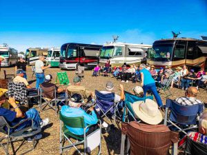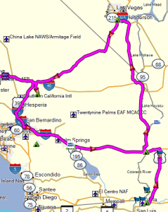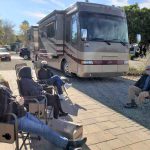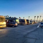 Another early start hitting the road just before 7:00 after coffee and biscochos. Our streak of sunny weather continues. The start of today’s travels was uneventful. A rest area provided us with stopping place for a quick lunch. As we journeyed farther south we encountered more and more of California’s infamous traffic. Being a Friday it appears traffic starts getting heavy before 2:00. Our 3:30ish arrival time turned into a 5:00ish arrival time (after dark!) at Golden Village Palms in Hemet. A 10 hour day on the road! Then came the fun of getting settled into our spot – in the dark. We had a pull through reserved so we didn’t have to disconnect the tow car. Their map showed us in the 4th spot from the end, right next to the pickleball courts. Instead of counting the spots as we went we aimed for the spot next to the courts which turned out to be 5th spot which was not on the map and it wasn’t a pull through! Since we can’t back up with a connected tow car we had to disconnect, back out, and pull into the proper spot. Finally settled in, we enjoyed a pasta with leftover lasagna sauce and rosemary bread dinner, some TV, and an early turn in.
