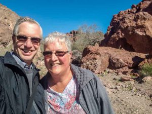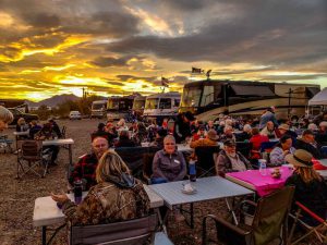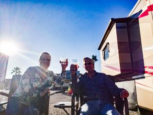 Yes, this entry covers 2 weeks! That should give you an idea of how routine our lives are here in Yuma. The important date during this time was Pat’s 63rd birthday. Laurie made breakfast sandwiches to start the day, and Mom made her wonderful chicken dish and also had a chocolate cake with candles to end the day. In between we enjoyed talking to all the kids and getting some Yuma sun. We did get in a couple days of shuffleboard but a lot of the afternoons have been a little too too windy to play. We have ridden our bikes around the park, gone for walks, picked up Walmart grocery orders, sat in the sun on the patio (where the RV blocks the wind), and continued to watch “The Walking Dead” in the evenings. The last few days were very sunny, the temperature reached into the 80’s, and we had some spectacular sunrises and sunsets. Our priority these days is to try to get M&D covid vaccines. Yuma has moved into the phase that covers adults over age 75 but the first week all the times were filled and now they are waiting for more vaccines, which is supposed to happen this week. Tuesday we will be calling at the given time to try to set up appointments. We’ll keep our fingers crossed and keep on trying!