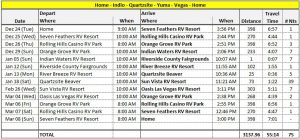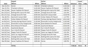 It’s been a long time since we’ve ventured anywhere outside the house, as we’ve been locked down due to Covid-19 (aka Coronavirus). We’ve been hunkered down with Mom/Dad since returning from Yuma nine months ago. We are all anxious to get out and start doing things again! This year we are aiming to get an early start. We will combine Thanksgiving with Hanukkah (“Thanksgivukkah”?) with Robin, Sijia and Evie, and start heading south the following week. Mom/Dad will be joining us on our travels, and will be staying in a Park Model at the same RV resort (“Sun Vista RV Resort”) just a short distance from our reserved RV spot. The current agenda is as follows: