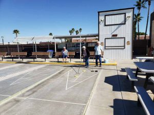 It’s been a typical week with mostly sunny, pleasant weather. We did have one cloudy, cool day as well as one short burst of rain early one evening. There were a couple of gorgeous sunrises with the mountains in the background that we viewed out the front window of our RV. We continue to alternate having dinners here or at M&D’s, including some delicious grilled meals here preceded by a happy hour on the patio soaking up the late afternoon sun and enjoying each other’s company and conversation. Finally everything came together to spend an afternoon playing shuffleboard together. There wasn’t anyone else on the courts but we had our masks handy. Laurie sanitized everything with alcohol sanitizer and wipes – cues, discs, the wax container, and even the marker for keeping score. We played “Guys” vs “Dolls” and had a lot of fun while getting in a little exercise. (The “Dolls” won both games!) On Christmas Eve Sun Vista had a parade of decorated golf carts and bicycles that drove around the park which was kind of cute. During the week there also were the usual items such as RV maintenance, cleaning, a Walmart pickup, watching The Walking Dead in the evening, etc.