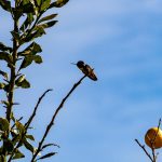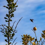 One of the hummingbirds zipping around has made itself a daily visitor to the lemon tree just outside our door. Throughout the day it comes and goes, landing on the leafless end of a branch or hovering in place. When the sun hits it later in the afternoon we can see it’s back is a very dark shade of green and it has shimmery reddish color on the front of it’s neck.